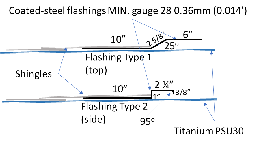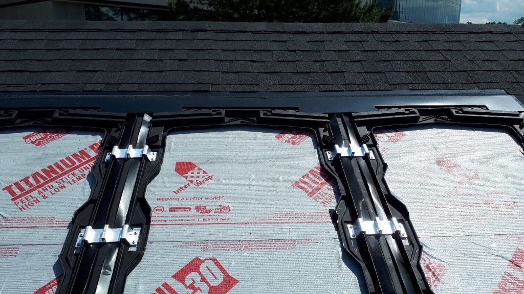 In Canada, the CHE BIPV system must be mechanically attached to the roofing deck by six (6) brackets per frame/solar-PV module and must use locking bars parallel to the slope of the roof and snow deflectors installed perpendicular to the slope of the roof.